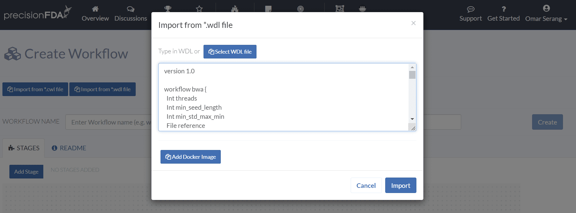 Importing a workflow from a WDL specification based on Docker images provides convenient way to express precisionFDA workflows in a serialized textual format. From My Home / Workflows, click the Create Workflow button, and click the Import from *.wdl file button. Enter the following WDL in the text input and click Import.