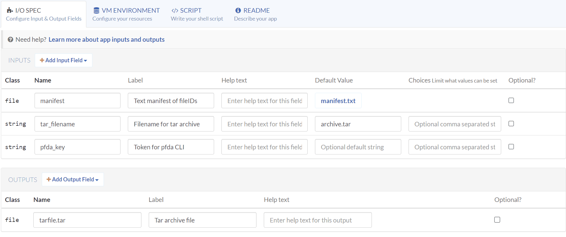pfda upload-file -key $key -file manifest.txtCreate a tar_files_from_manifest app titled "Tar a manifest of fileIDs", with the following I/O Spec.