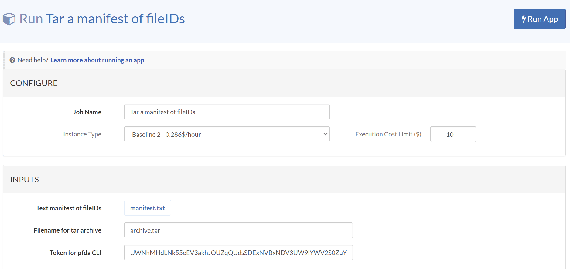 Input a manifest file containing a list of fileIDs and the name of tar archive file. You\'ll need to provide a temporary authorization key for use with the pfda CLI and thus you should only run this app in your My Home or Private Spaces.Run the app with the default inputs and a fresh authorization token for the pfda CLI and observe the new archive.tar file.