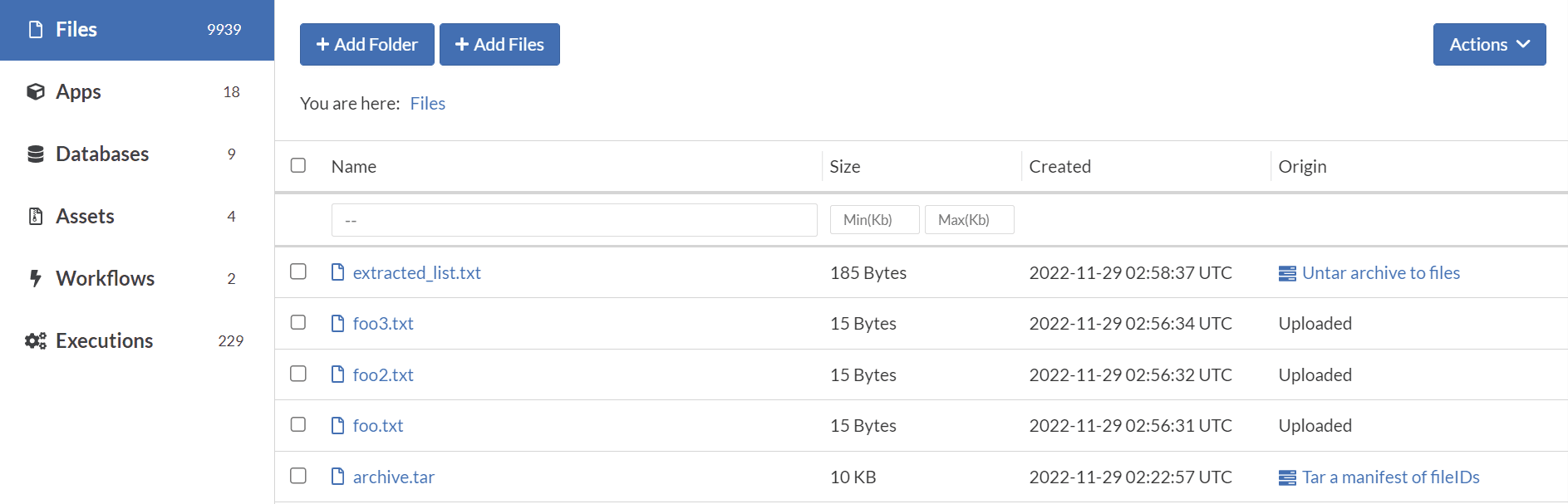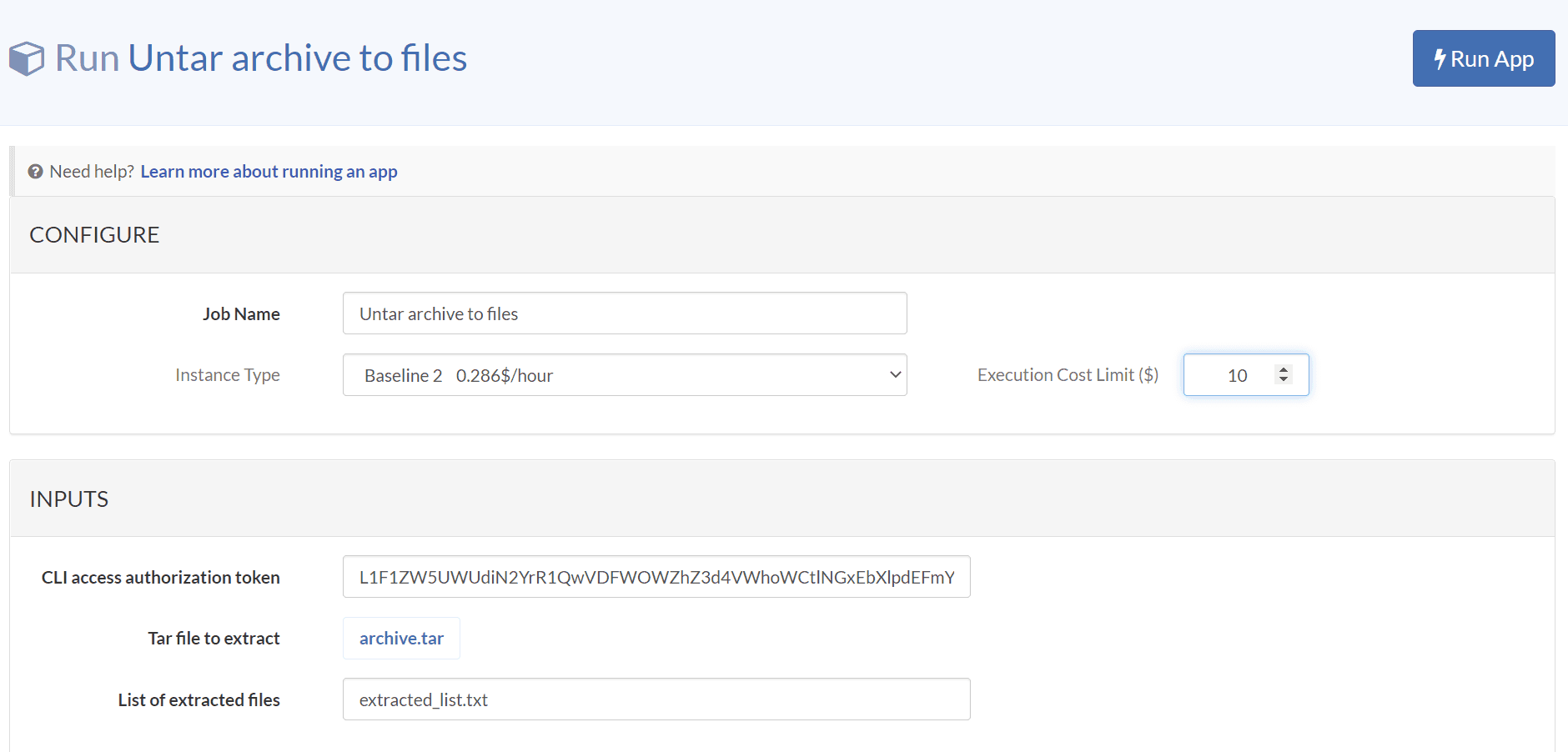 Input a tar archive file to extract into individual files. You'll need to provide a temporary authorization key for use with the pfda CLI and thus you should only run this app in your My Home or Private Spaces.Run the app with the default inputs and a fresh authorization token for the pfda CLI.